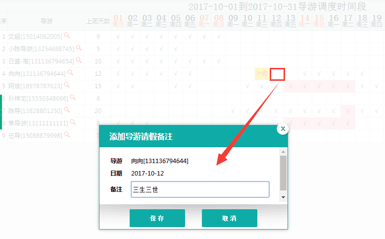 亲~ 可以在【计划管理】的【导游调度】里面查看每个导游的当月带团情况,已经打勾的说明这个时间段已经被安排到团上了哦~ 如果有请假的,可以点击要请假的日期,会弹出一个请假备注框,输入请假理由就可以了,保存之后在界面上会用黄色的底色标出来。