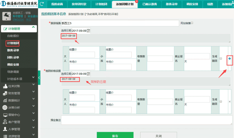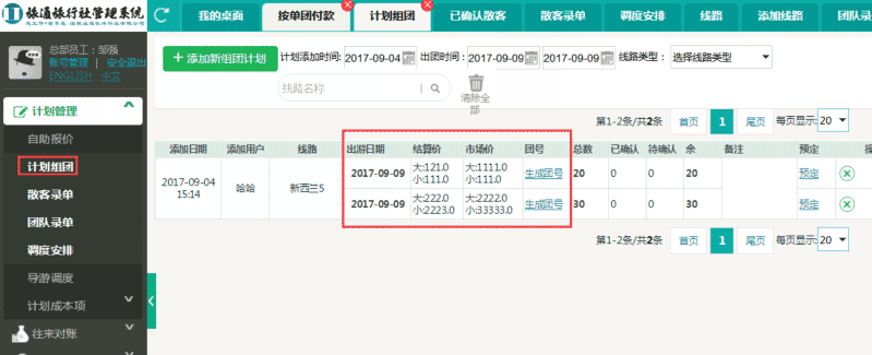 在列表外面点击【预定】来预定计划,确认后直接点团号下【生成团号】