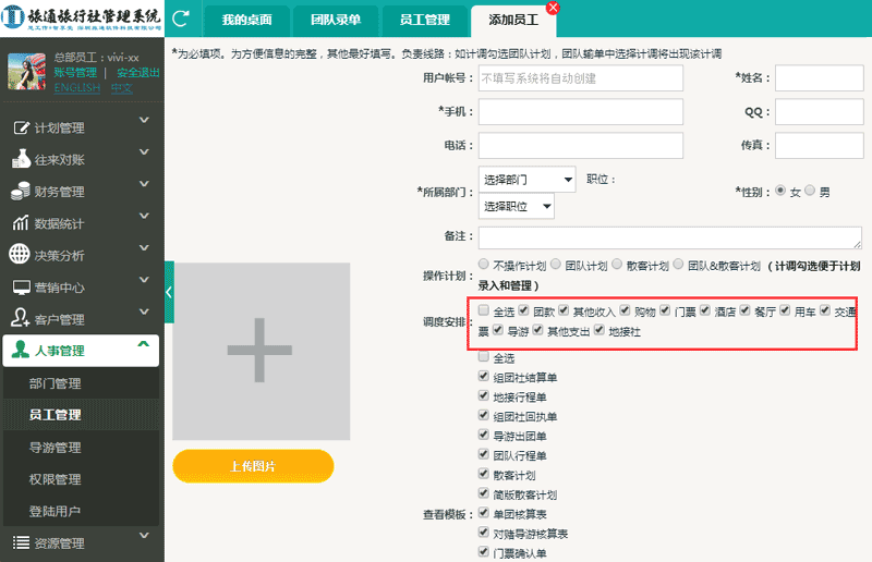 亲,如果您的计调分工比较细致,有分别去安排门房餐车这样的操作的话,您可以在员工管理这去设置: