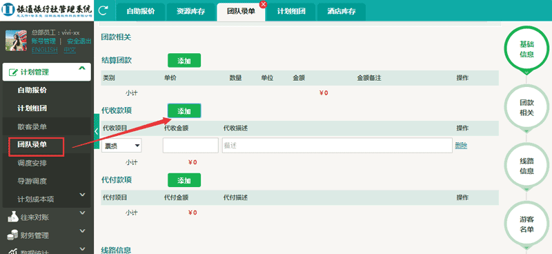 1.【计划管理】-【团队录单/散客录单】添加代收