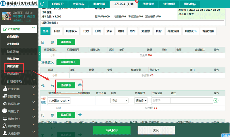 在地接系统中,如果客人有团款是直接到当地给导游的,您可以在添加计划或者调度安排的录入代收。