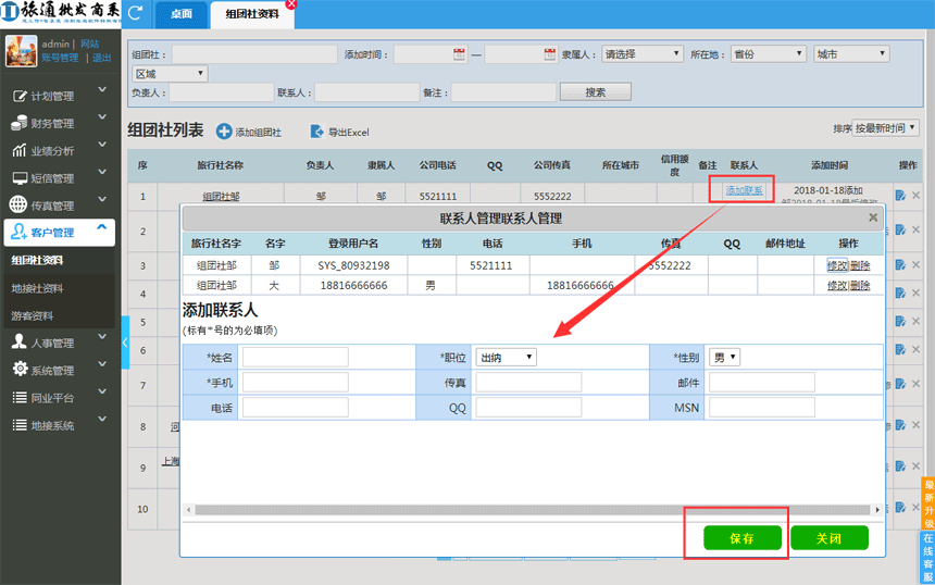 首先我们打开客户管理界面点击组团社资料:点击列表下【添加联系】后您会看到这样一个界面(如下图所示)将相关信息填写保存即可。
