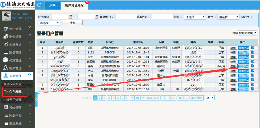 1.【人事管理】-【用户权限分配】-操作状态启用