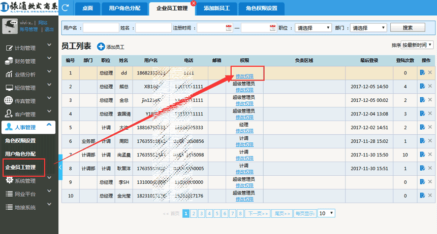 3.【人事管理】-【企业员工管理】-添加的员工是否有勾选权限